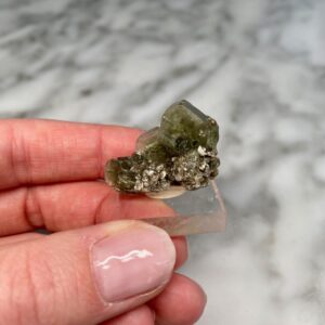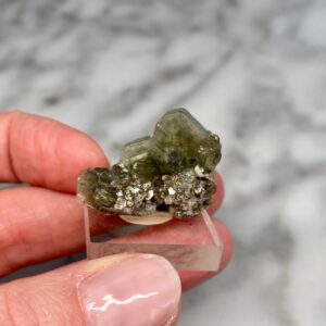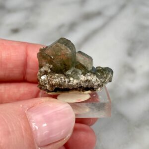 - Particularité : Beau spécimen composé de trois cristaux d’apatite avec belle couleur, forme et transparence, alignés sur un lit de cristaux miniatures de muscovite.