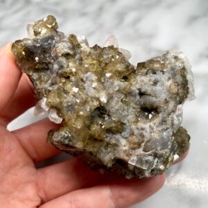 - Le spécimen présente des cristaux des deux côtés, principalement de la calcite d’un côté et de la fluorine de l’autre.
