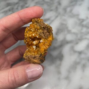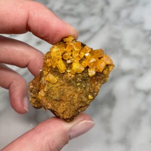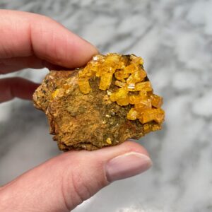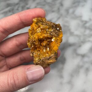 - Particularité : Cristaux lustrés, orange vif sur plusieurs faces, plus grands d’un côté, plus petits de l’autre.