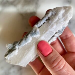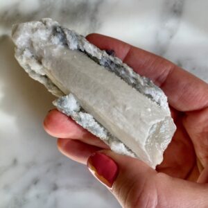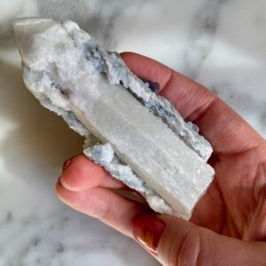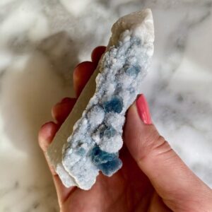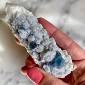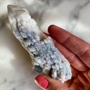 - Particularité: Pointe de quartz très intéressante présentant deux couches de cristallisation. Le noyau de quartz est clair, l’extérieur est en quartz blanc avec des gravures naturelles bien définies consistant de mini pointes de quartz. Saupoudré de fluorites bleues bien formées avec belle cristallisation cubique.