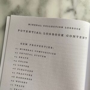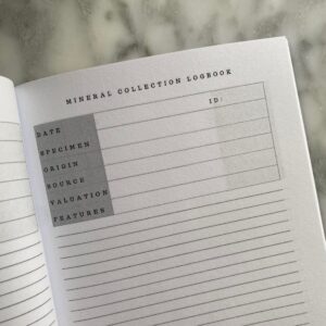 - 90 pages de registre de spécimens de cristaux individuels (incluant section pour date, identifiant, spécimen, origine, source, valeur, caractéristiques et section lignée pour ajouter les caractéristiques de votre choix