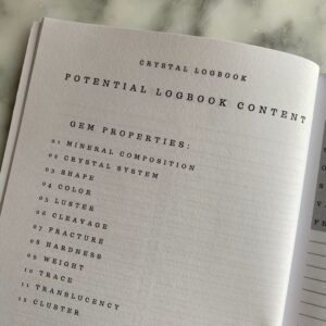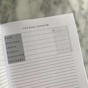 - 90 pages de registre de spécimens de cristaux individuels (incluant section pour date, identifiant, spécimen, origine, source, valeur, caractéristiques et section lignée pour ajouter les caractéristiques de votre choix