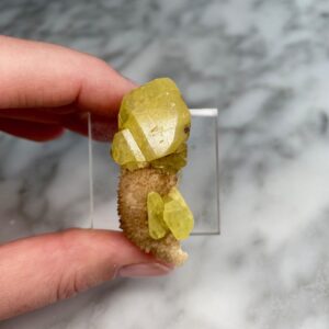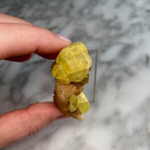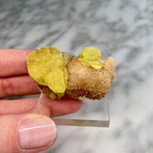 Ces spécimens uniques, comme ce soufre de Mina Cozzodisi, sont sélectionnés à la main pour la qualité de leurs caractéristiques et sont intéressants pour des raisons esthétiques, scientifiques ou historiques. Les collectionneurs sont invités à nous contacter pour des achats privés. Nous aimons tenir compte des demandes spéciales lors de l’approvisionnement de nos spécimens.
