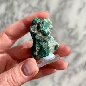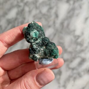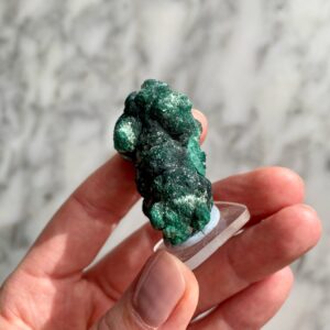 - Beautiful bright green crystal druze on the malachite’s botryoidal formation.