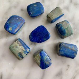 Azurite is a striking copper carbonate mineral (Cu₃(CO₃)₂(OH)₂) best known for its deep, vivid azure-blue color. Its name is derived from the Persian word lazhward, meaning “blue.” Azurite commonly forms in the oxidized zones of copper ore deposits, often occurring alongside malachite, chrysocolla, and cuprite. In its natural crystalline state, it may appear as prismatic or tabular crystals, botryoidal clusters, or earthy masses, though tumbling brings out its saturated blue color and smooth polish.