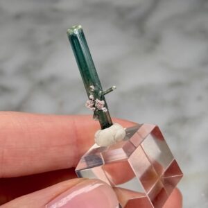 • Stunning, gem quality elbaite tourmaline with deep blue-green coloration. Termination is lighter in color. Exceptional transluscency and parallel growth striations. Specimen is adorned by miniature tourmaline points of the same color and clusters of light pink lepidolite rosettes near the base.