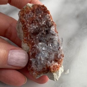 - Particularity: Great colour contrast between the lustrous, light blue celestite crystals and the red matrix.
