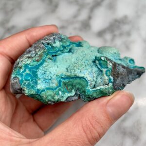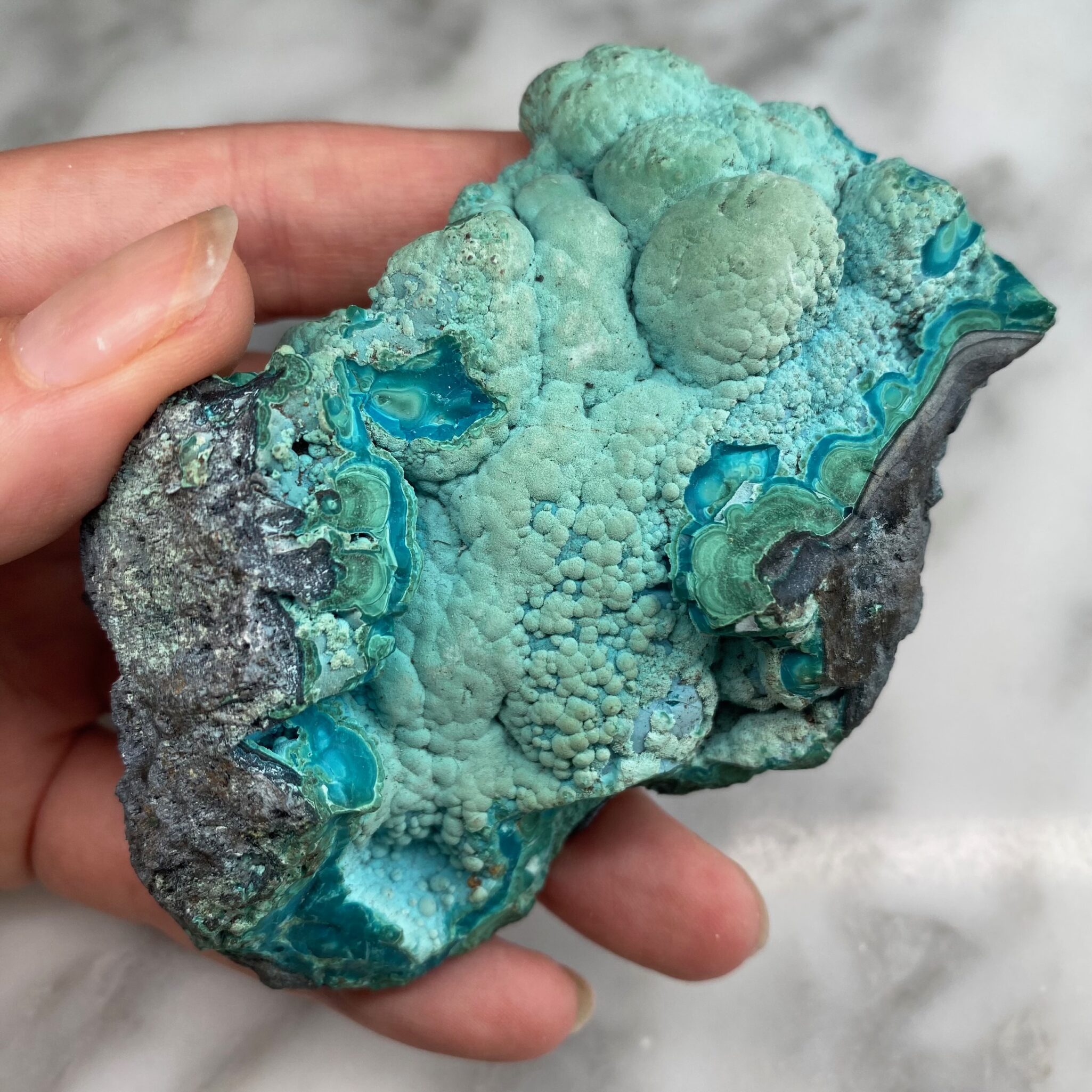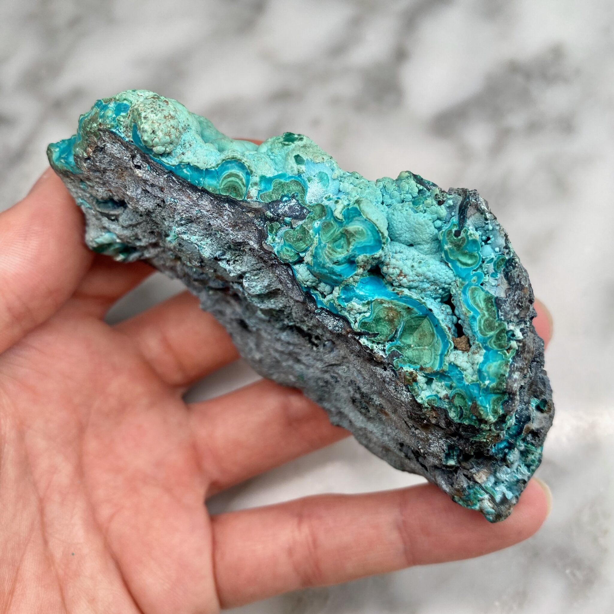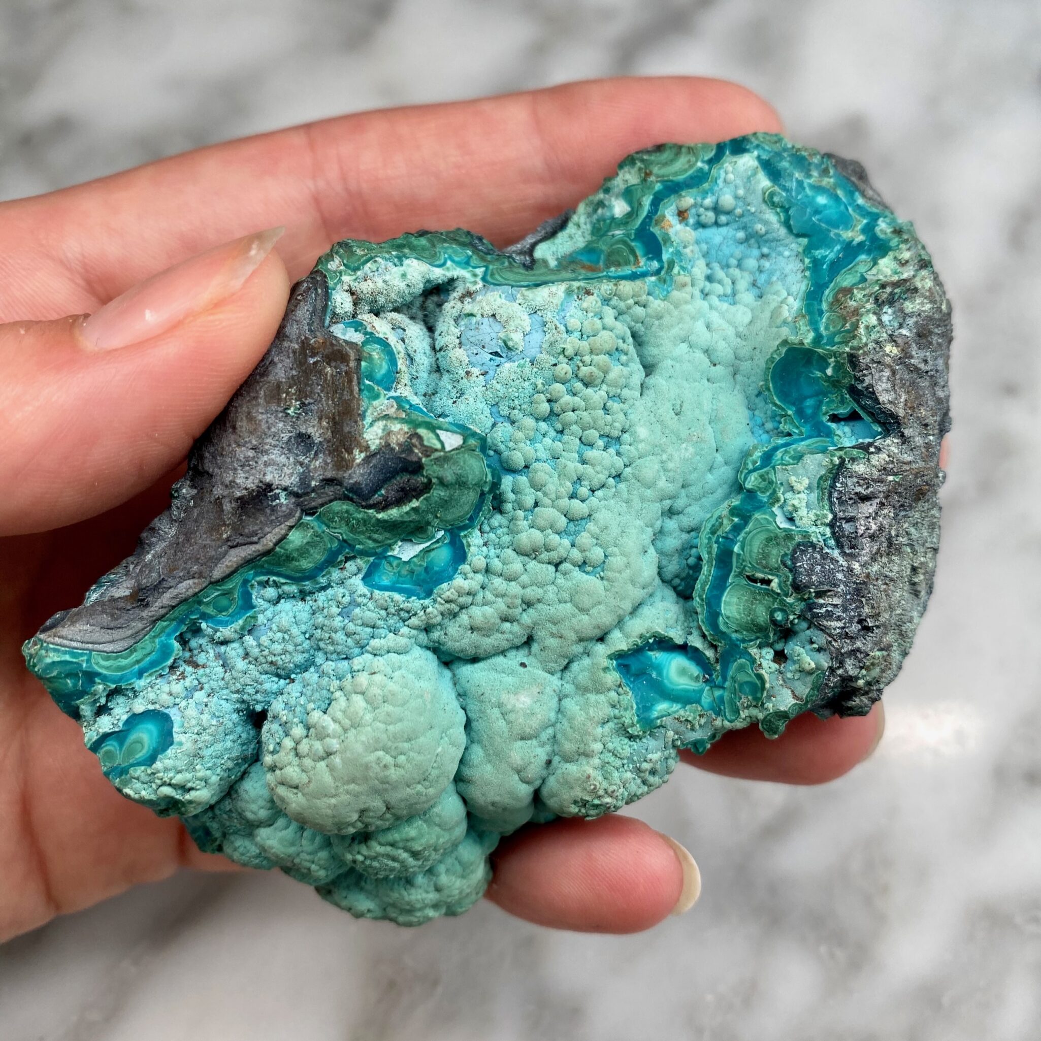 - Particularity: very aesthetic piece with colourful contrast between the chrysocolla and malachite. Lovely malachite banding and pronounced botryoidal formation of light blue chrysocolla.