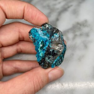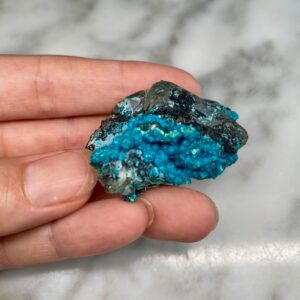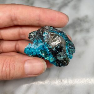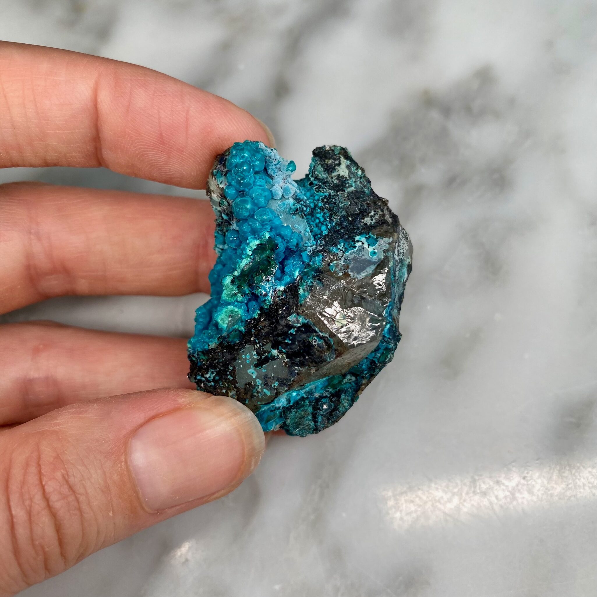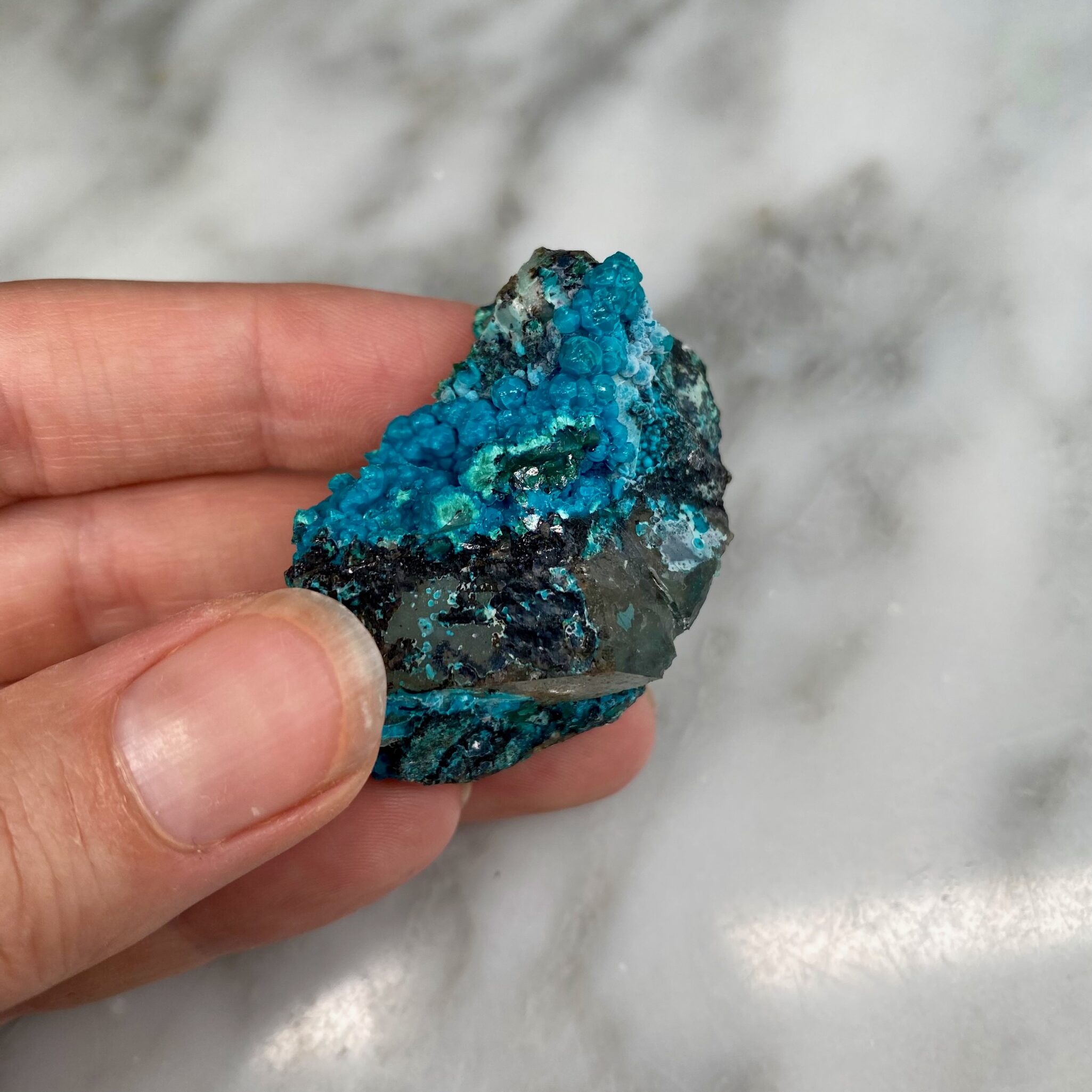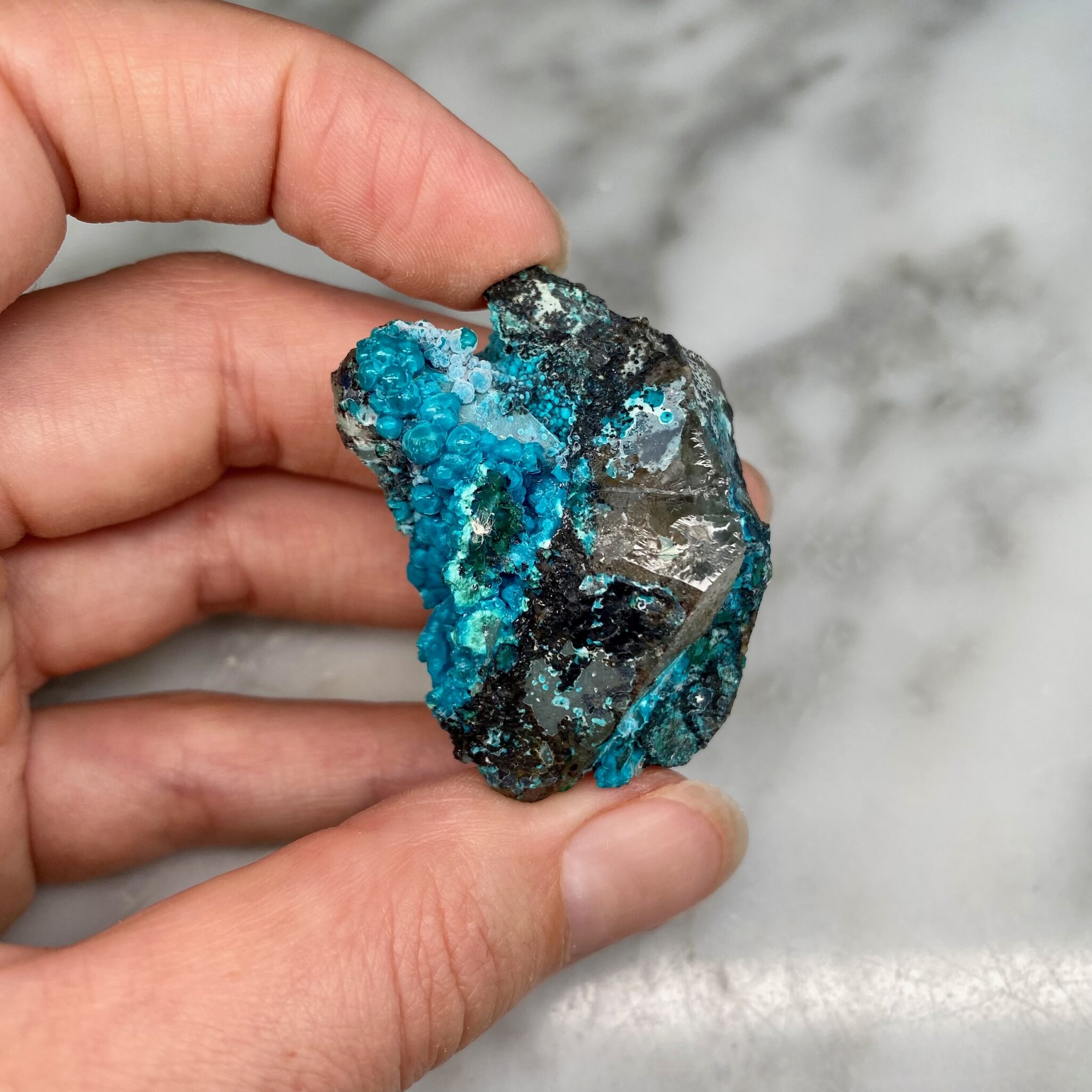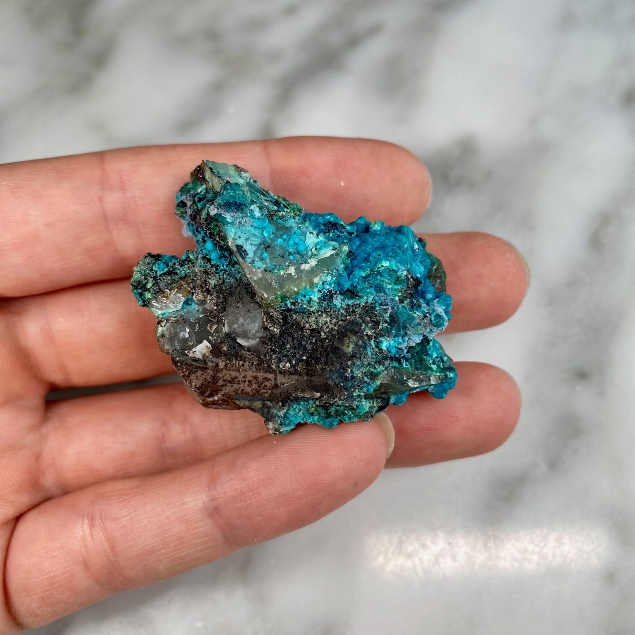 - Particularity: Deep blue botryoidal chrysocolla perched on quartz, two quartz points being particularly discernible on certain faces of the specimen.