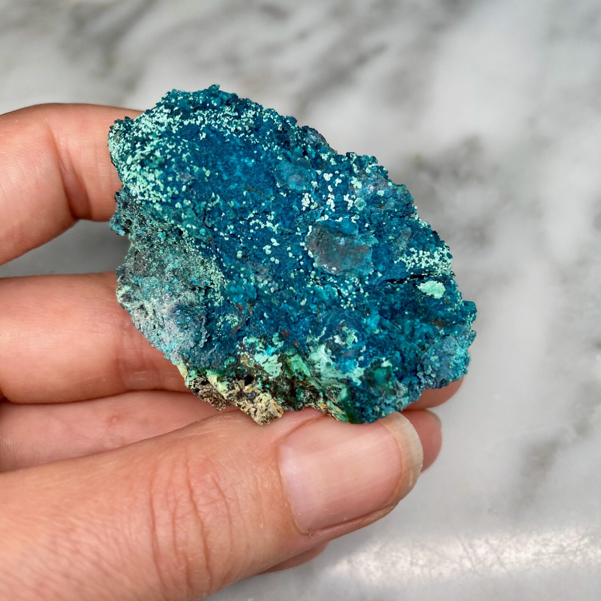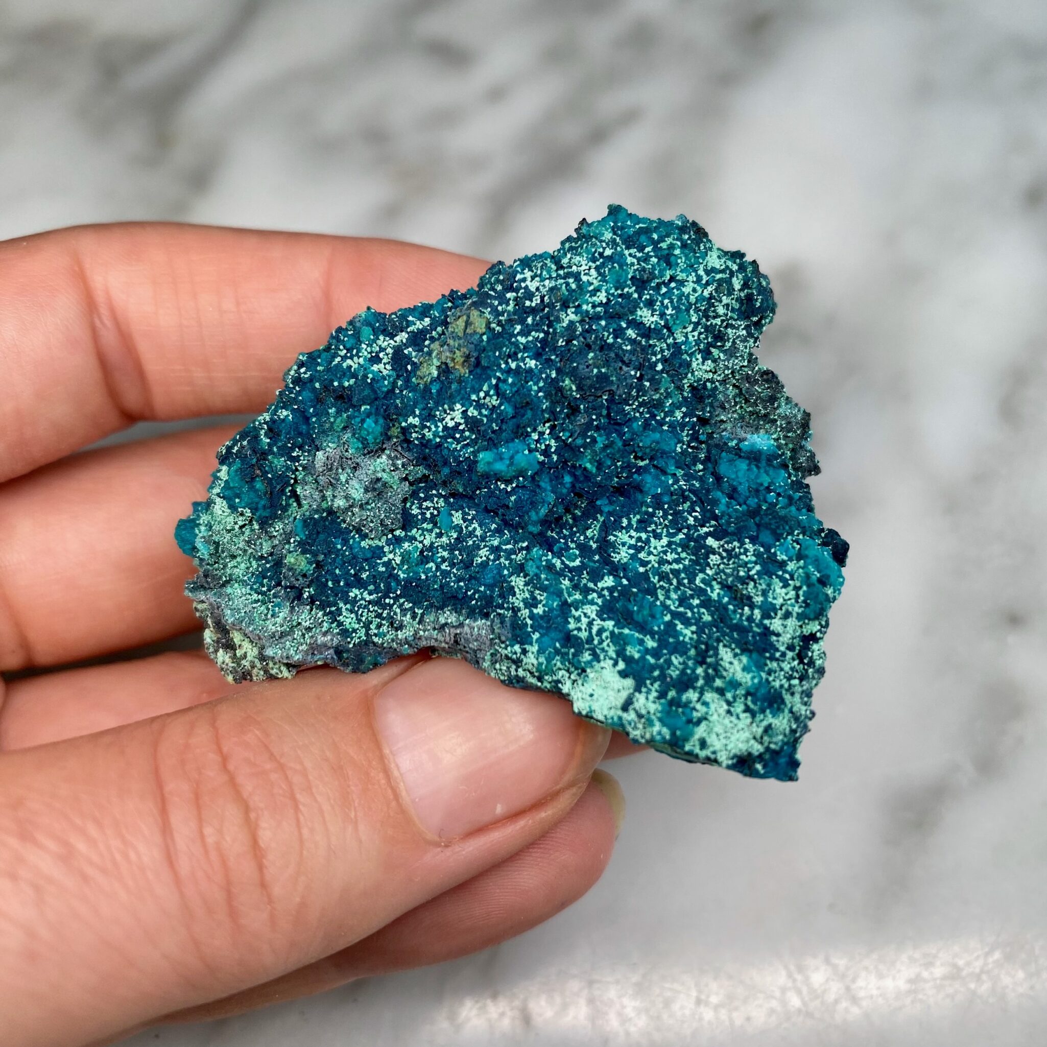 Chrysocolla from Tentatora Mine, Peru. Lovely varying shades of blue and green on all sides of the specimen.