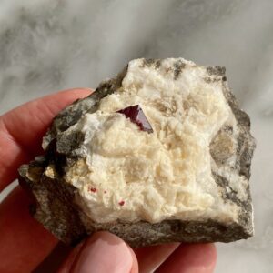 These unique specimens, such as this specimen of cinnabar crystal on calcite and dolomite from China, are hand-selected for the quality of their features, and are of interest either for aesthetic, scientific or historical reasons. Collectors are invited to contact us for private shopping opportunities. We enjoy keeping in mind special requests when sourcing our specimens.