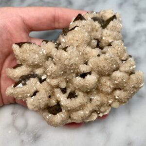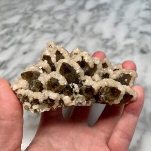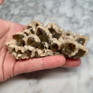 - Particularity: Very aesthetic cluster of smoky quartz points partially coated with a druzy of white dolomite crystals