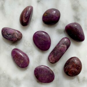 A specimen of ruby corundum tumbled pocket stone.