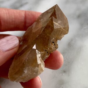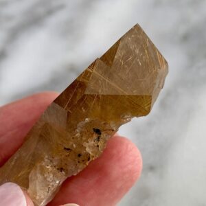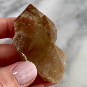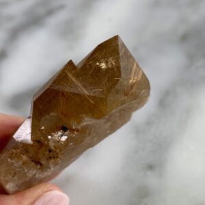 - Particularity: Twinned clear quartz points with distinct golden rutile inclusions