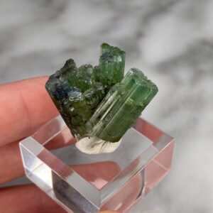 - Stunning, gem quality green elbaite tourmaline with green to blue-green coloration. Termination is lighter in color and more transluscent. Great multi-directional crystals of significant size.
