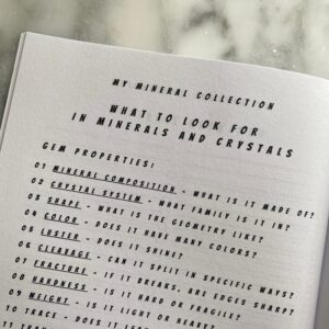 - 90 Individual crystal specimen logbook pages (including designed space for date, ID, specimen type, origin, source, valuation, features, and lined space for additional information of your choice)