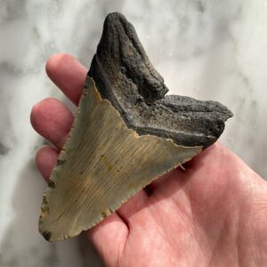 Shark skeletons are made of cartilage that does not fossilize easily, but their teeth, being very solid, have survived the passing of time. These creatures were estimated reaching 50 to 60 feet in length. It is interesting to note that the megalodon shed its teeth as it grew.