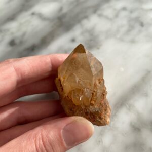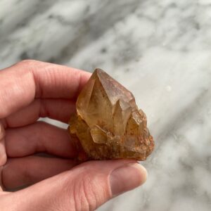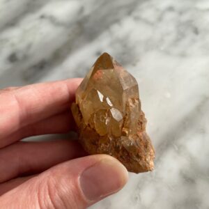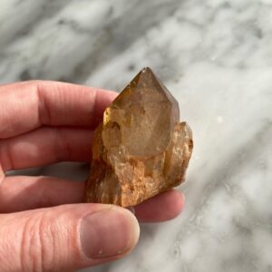 - Particularity: white phantom within the main quartz point. The main point is surrounded by smaller quartz points in what is referred to as a cathedral formation.