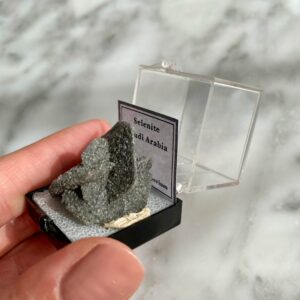 A beautiful selenite specimen from Saudi Arabia, in thumbnail specimen box with identification tag.
